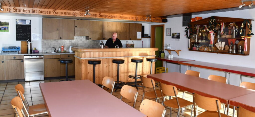 Die Buvette ist ausgerüstet mit sämtlichen Küchengeräten und bietet grosszügige Kühlmöglichkeiten. Komplette Gerschirrgarnituren können ebenfalls genutzt werden. Im Saal stehen ihnen zur Einrichtung diverse Tische und Stühle zur Verfügung, welche für ca. 60 Personen Platz bieten.